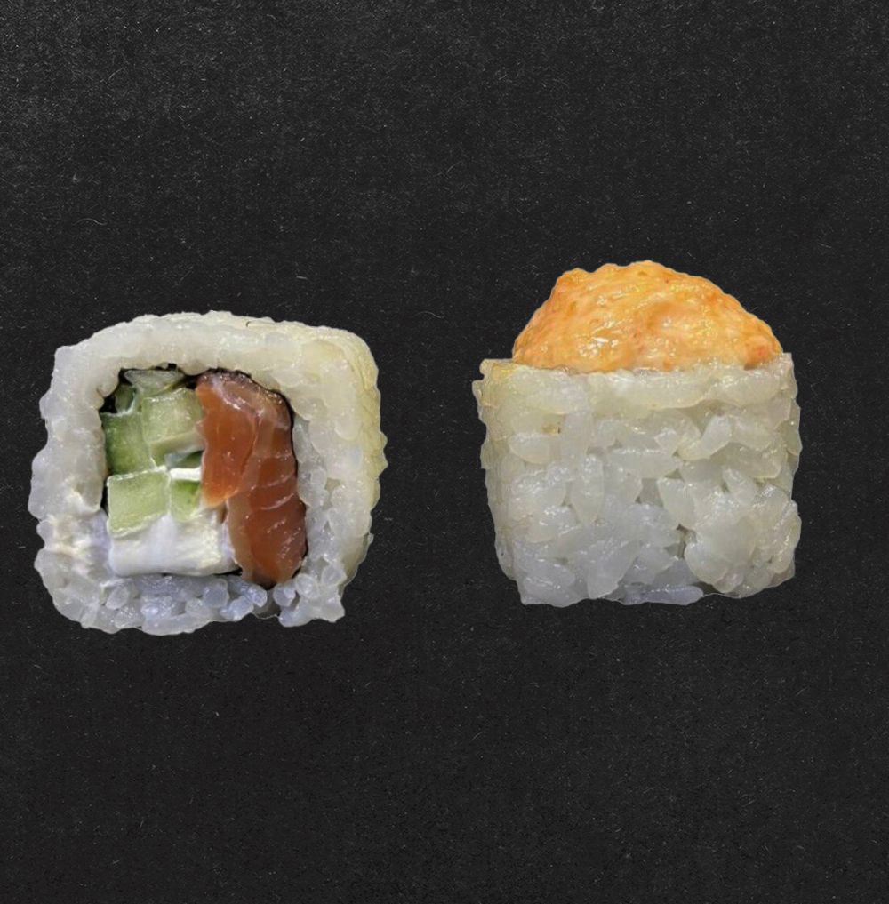 Рис, нори, творожный сыр, соус Яки, лосось, огурец, кунжут