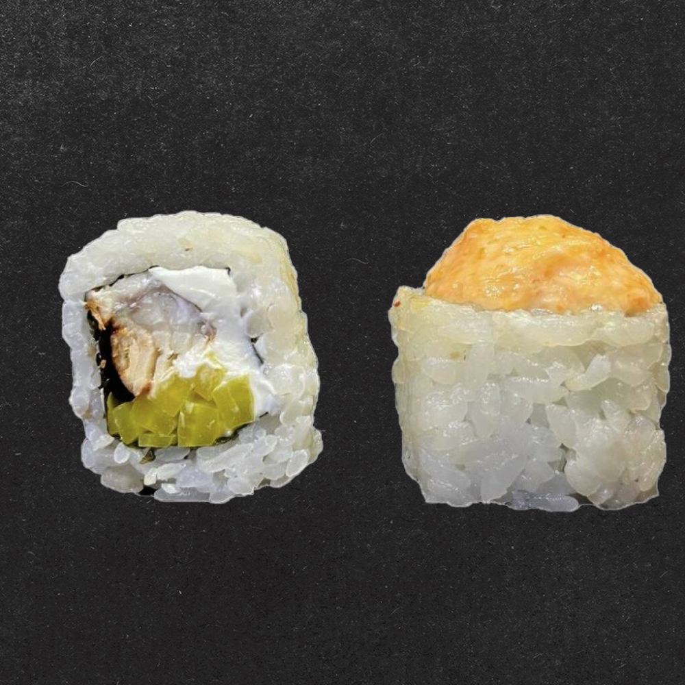 Рис, нори, творожный сыр, соус Яки, угорь, такуан, кунжут