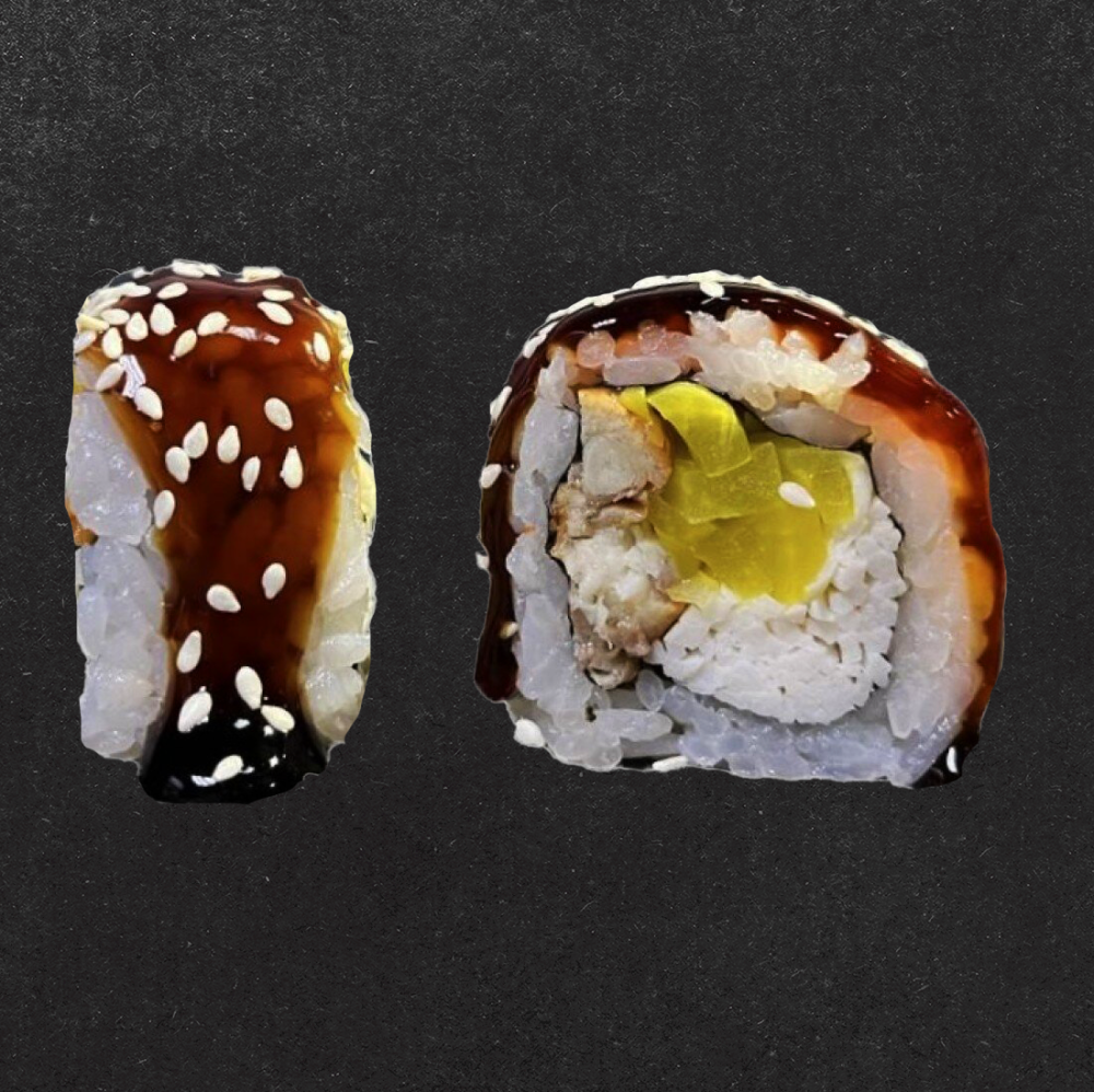 Рис, нори, творожный сыр, такуан, угорь, снежный краб, соус унаги, кунжут